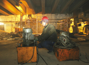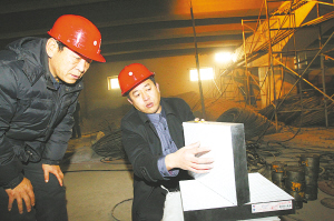 負(fù)責(zé)現(xiàn)場施工的項(xiàng)目經(jīng)理張洪強(qiáng)告訴記者,為保護(hù)橋梁,在T梁與橋墩之間安裝有橡膠支座,主要起到緩沖、減壓作用。東二環(huán)跨和平路橋建于1996年,使用至今沒有經(jīng)過任何大修。由于交通流量過大及橡膠老化等原因,部分橡膠支座嚴(yán)重變形,個別T梁底部已觸及橋墩,形成安全隱患,必須更換。