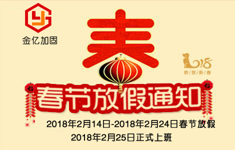 2018年春節(jié)期間石家莊金億加固公司放假時間為:2018年2月14日-2月24日,共11天。2月25日正常上班。